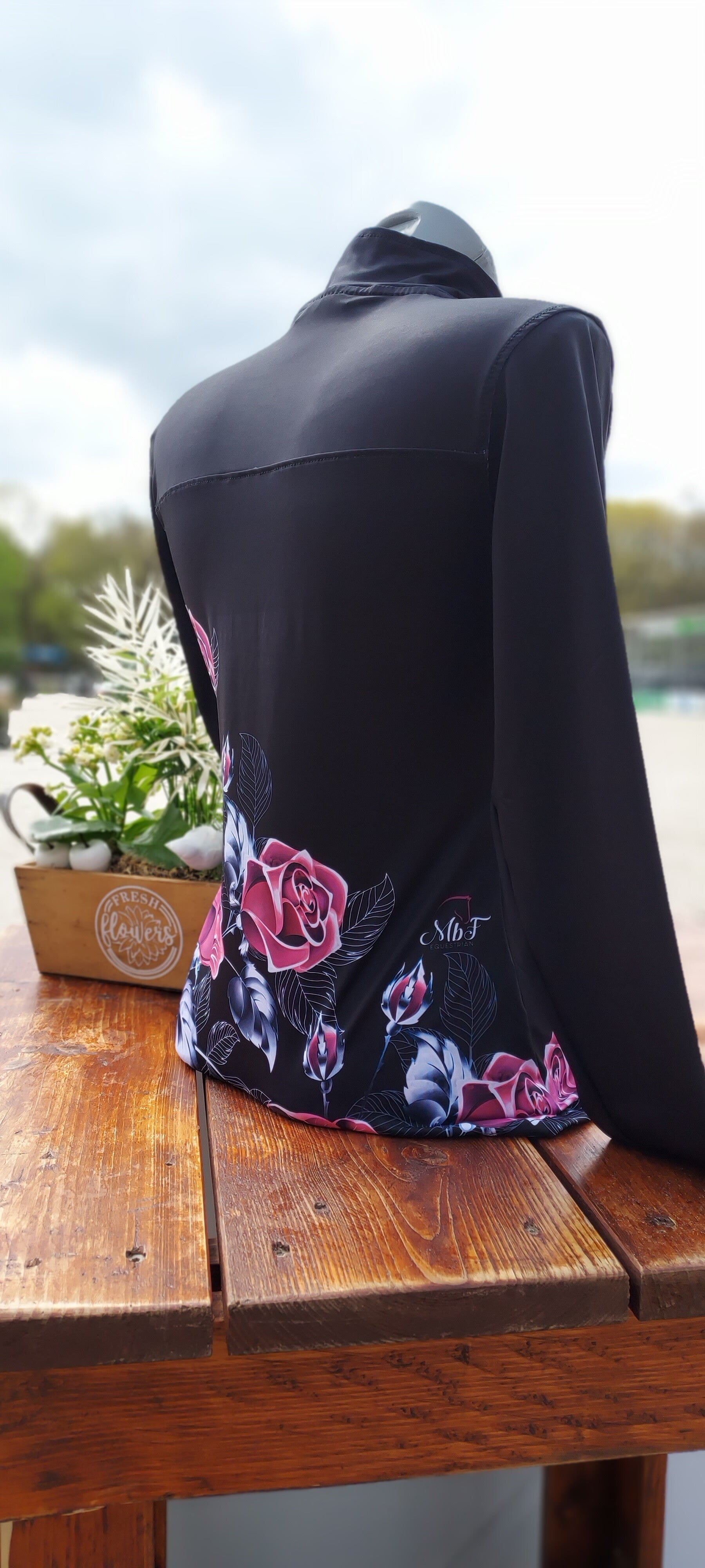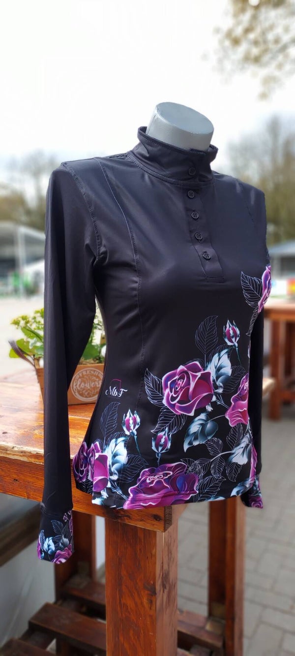 75% polymide 25% elastine. Quickdry , 4 way stretch met hoge boord die ook als kraag gedragen kan worden. Ons prachtige design rozen in fantastische frisse kleuren.