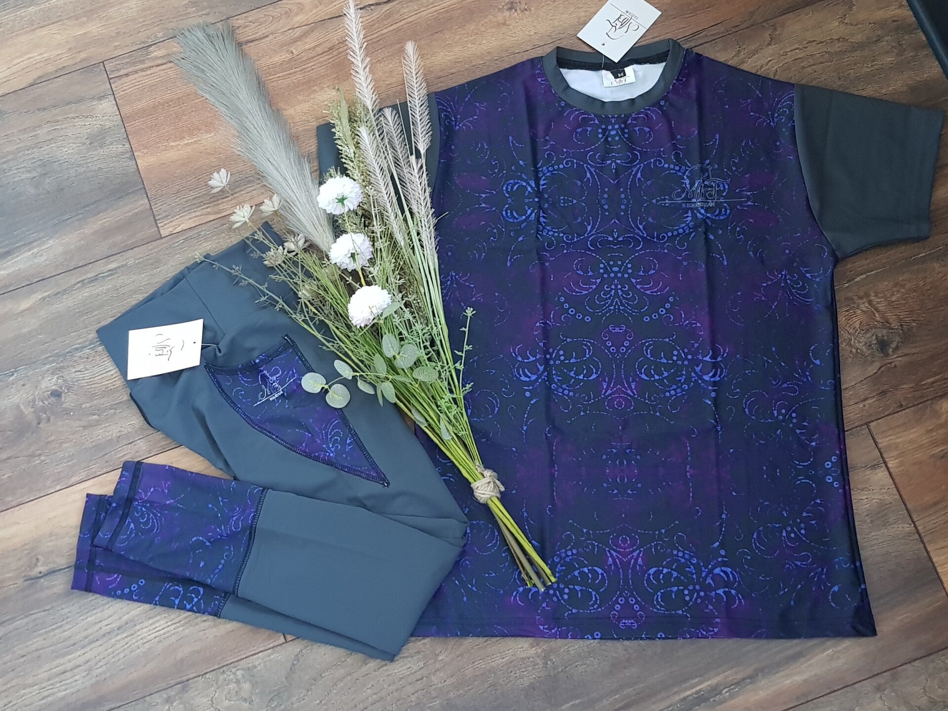 Grijze mouw en kraag op een sublimation artprint paars tint.