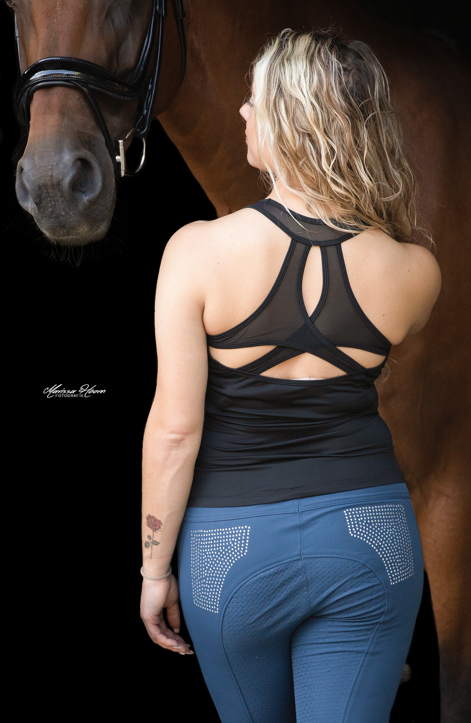 Hoogwaardige kwaliteit middel waist rijbroek met subtiele strass glitters op de voor en achterzakken. Fullseat silicone.